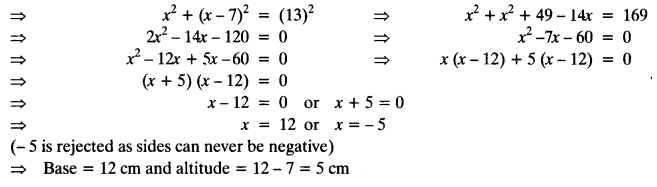 The altitude of a right triangle is 7 cm less than its base. If the hypotenuse is 13 cm, find the other two sides.