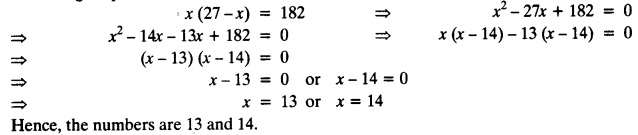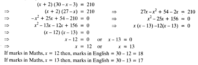 In a class test, the sum of Shefali’s marks in Mathematics and English is 30. Had she got 2 marks more in Mathematics and 3 marks less in English, the product of their marks would have been 210. Find her marks in the two subjects.