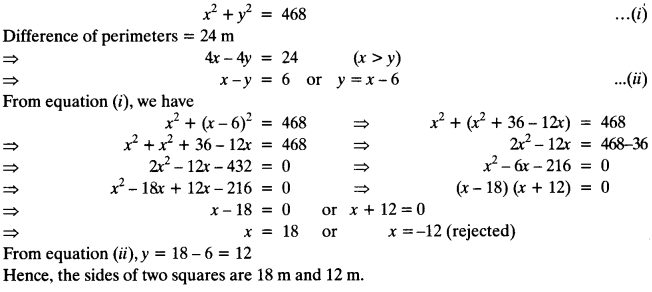 Sum of the areas of two squares is 468 m2. If the difference of their perimeters is 24 m, find the sides of the two squares.