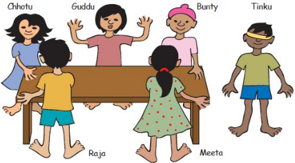 Edges and Corners Meeta and her 5 friends were playing a game. Tinku was blindfolded and asked to keep clapping as long as he wished while the others would move round a table. The moment Tinku stopped clapping, everybody would stop wherever they were. The child who was not at a corner would be out. Then she would be blindfolded.