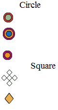 Triangles: Red Squares: Yellow Rectangles: Blue Circles: Green