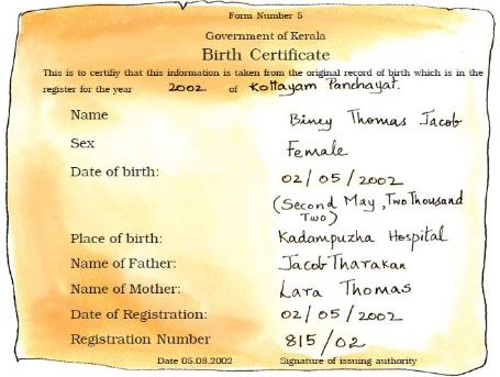 (1) 2/5/2002 shows that Bincy was born on 2 ____________, in the year 2002. (2) How old will Bincy be on 2 May 2008? ____________ (3) How old will she be in the year 2052? ____________ (4) On what date will she be eight years old? Write in numbers. ___________ (5) How many months old was Bincy on 2 August 2002? ____________ (6) How many years old is Bincy now? ___________ (7) After how many months of her birth was the certificate issued? (8) What is the registration number of her certificate? __________