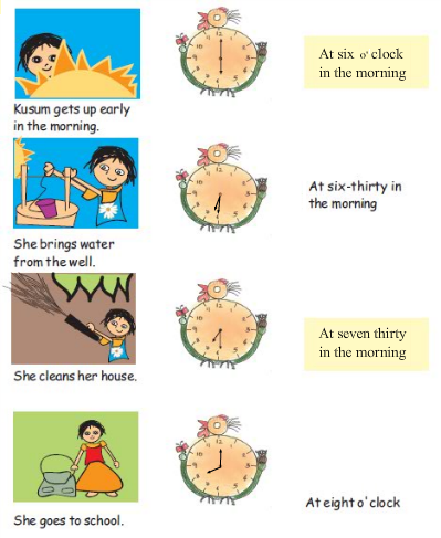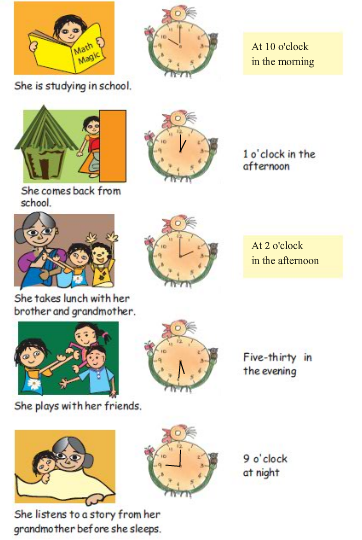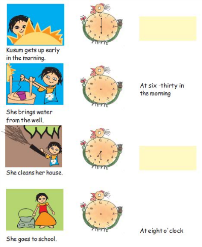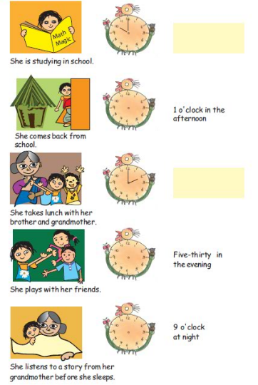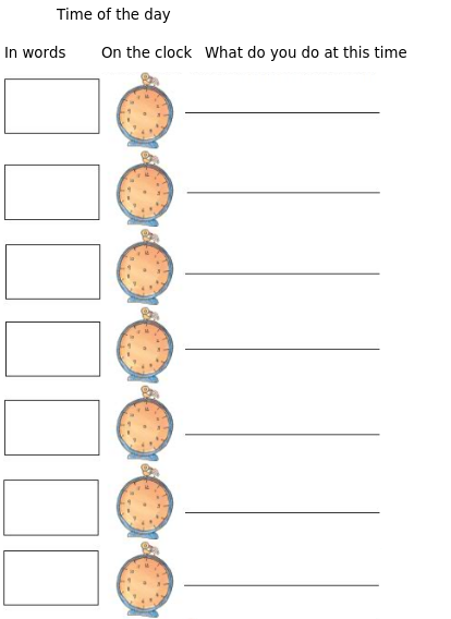 For some pictures the time is already written and you must draw the hands on the clock. In others you have to write the time shown by the clock.