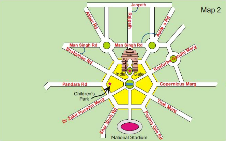 Look at the shape of the yellow area. Have you seen this shape before? How many sides does it have? This place is called the Central Hexagon. Find out from the map (1) If you are walking on Rajpath then after India Gate on which side would Children’s Park be? (2) Which of these roads make the biggest angle between them? (a) Man Singh Road and Shahjahan Road (b) Ashoka Road and Man Singh Road Road (the angle away from India Gate) (c) Janpath and Rajpath (3) Which of the above pairs of roads cut at right angles?