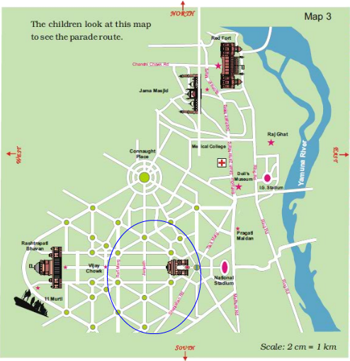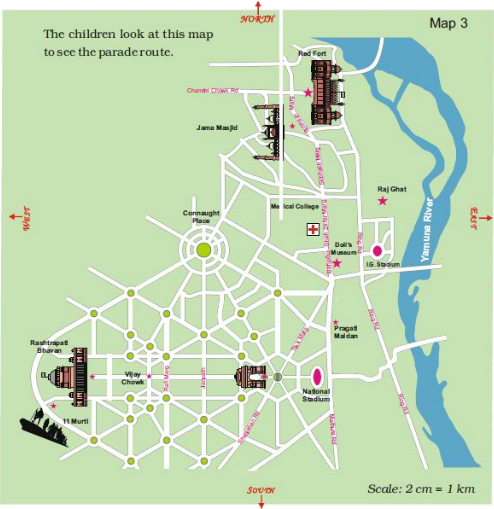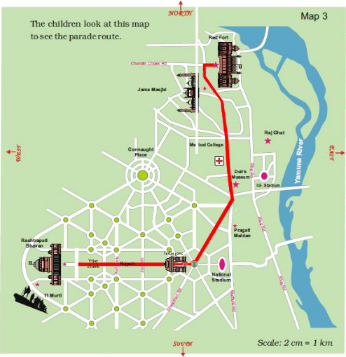 (c) Total distance of parade in the map is 16 cm. And we know that , 2 cm on map = 1 km Thus, 16 cm = 8 km