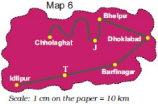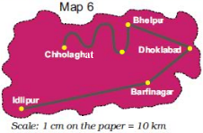(2) Here, the scale is 1 cm = 10 km Distance between Idlipur and Barfinagar on the map = 5 cm Now, actual distance between Idlipur and Barfinagar = 5 × 10 = 50 km