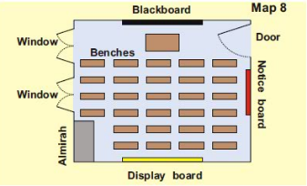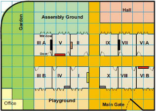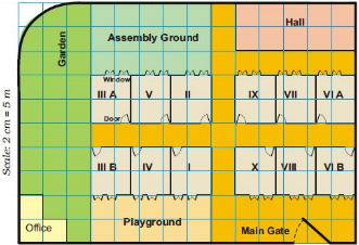 Look carefully and answer. (a) Which of these is exactly opposite to the blackboard? • Almirah, windows, notice board, display board (b) Now look at the school-map again. Guess and mark where would these be: • Blackboard in III A and VII • Almirah in IV and X • Notice board in V and VI B • Last seat of middle-row in II • Display board in I. (c) Can a child sitting in III A see the playground?