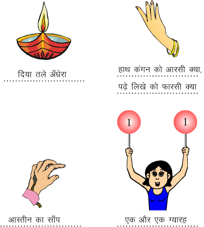 चित्रों को देखो। क्या इन्हें देखकर तुम्हें कुछ मुहावरे या कहावतें याद आती हैं? उन्हें लिखो।