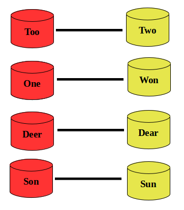 The red tea cups are filled with a particular word. Fill in the yellow tea cups with similar sounding words. Note the example given.