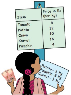 34kg of potatoes? (d) Keerthi is going for shopping. She has only Rs 20 with her. Can she buy all the things in her shopping list?