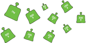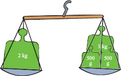 ×1000 g = 2000 g Following are the different ways in which we can make the two weights equal. 1) 1 kg + 500 g + 500 g = 2000 g 2) 1 kg + 500 g + 250 g + 250 g = 2000 g 3) 1 kg + 500 g + 250 g + 200 g + 50 g = 2000 g 4) 1 kg + 500 g + 200 g + 200 g + 100 g = 2000 g 5) 1 kg + 250 g + 250 g + 250 g + 200 g + 50 g = 2000 g We can make five different combinations to get 2 kg weight.