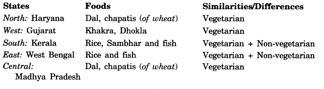 Choose one state each from north, west, south, east and central India. For each of these, prepare a list of foods that are commonly consumed, highlighting any differences and similarities that you notice.