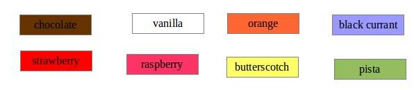chocolate vanilla orange black currant strawberry raspberry butterscotch pista